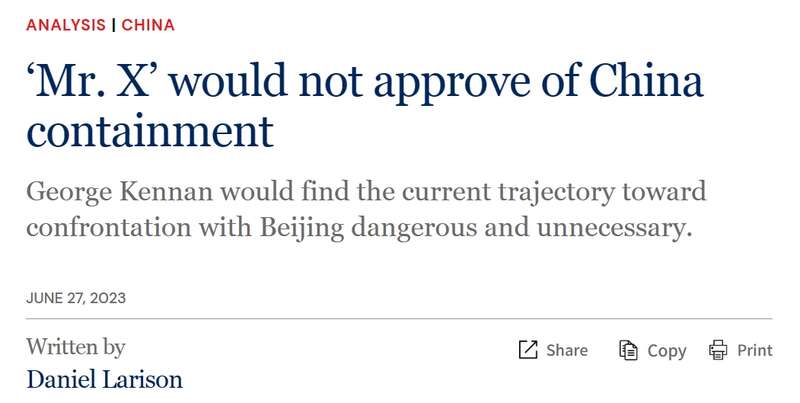美国昆西治国方略研究所网站7月3日刊登题为《X先生不会赞成遏制中国》的文章,作者是丹尼尔·拉里森。文章摘编如下: