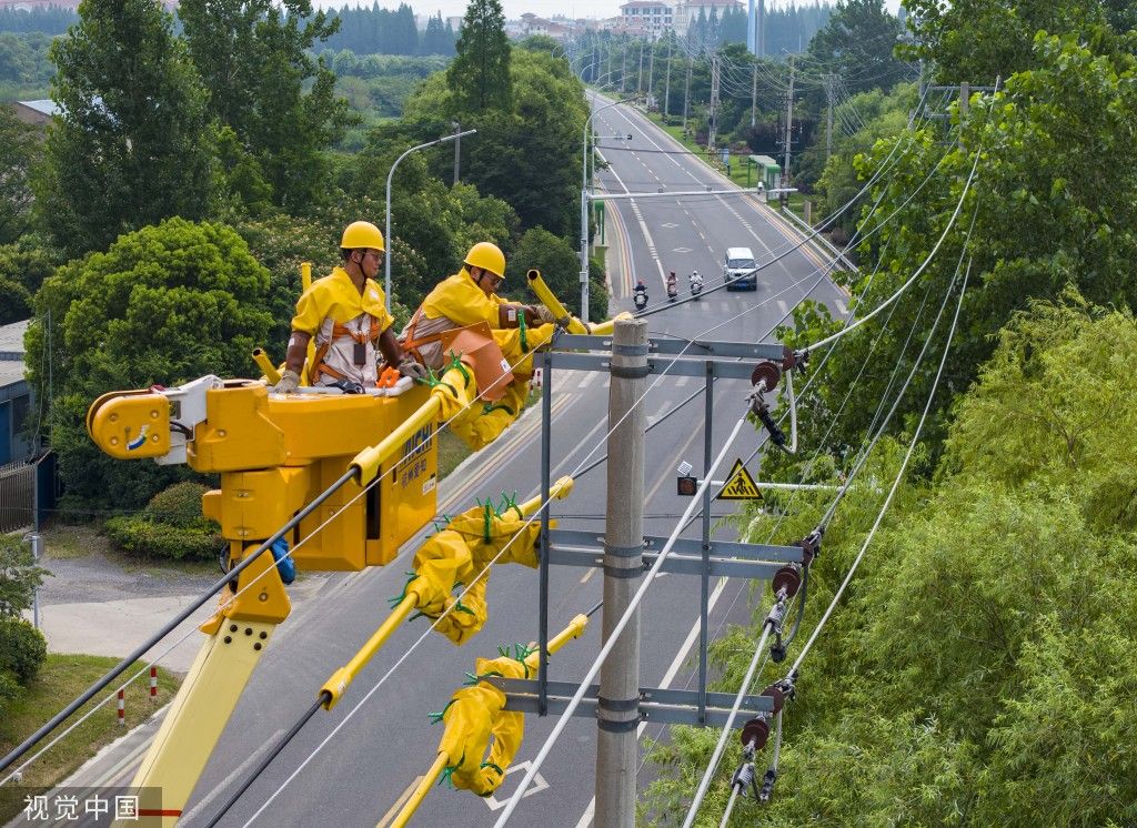 2023年7月6日,江苏泰州,带电作业人员全副武装在海陵区对10千伏采陵线耐张线夹温度异常进行抢修作业。