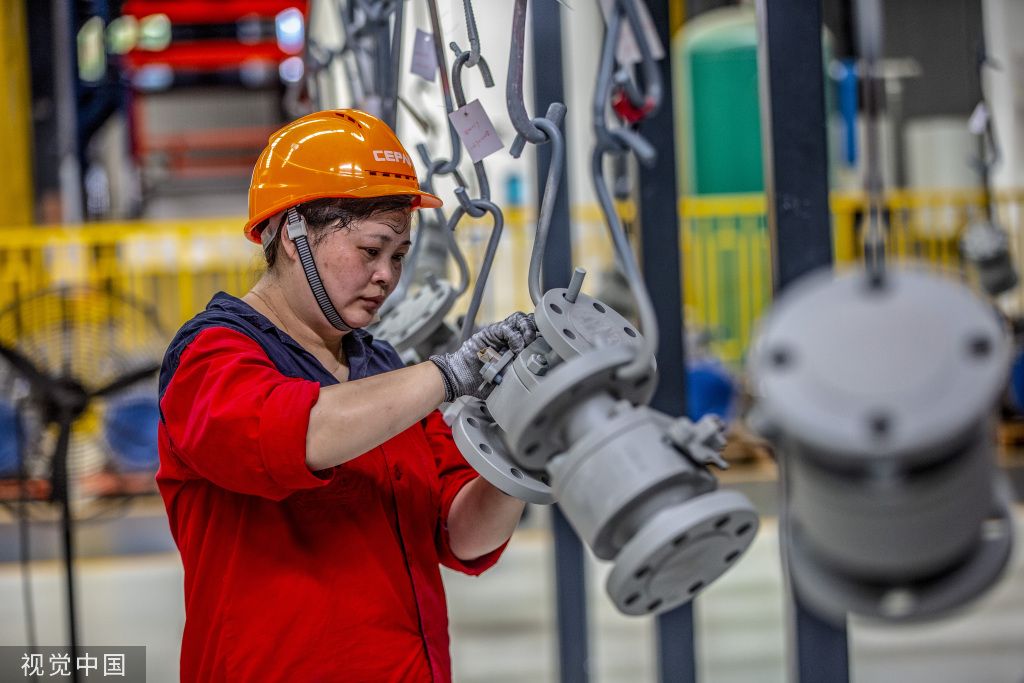 2023年7月5日,江苏淮安,金湖工业园区一企业工人正战高温,抓紧生产国内外订单。