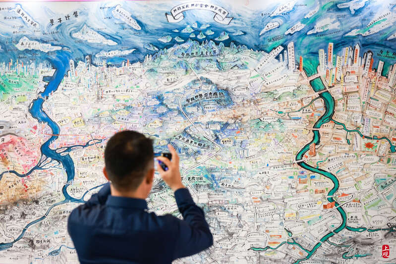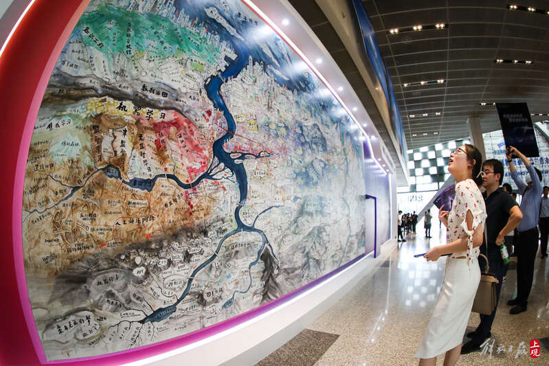 观众参观《智会世图》,该作品由中央美术学院副院长邱志杰创作,结合商汤“AI+AR”技术,将地图场景生动呈现,以纪念世界人工智能大会迎来创办5周年,画作描绘了人工智能发展史、世界人工智能大会历程以及上海人工智能的发展与应用。