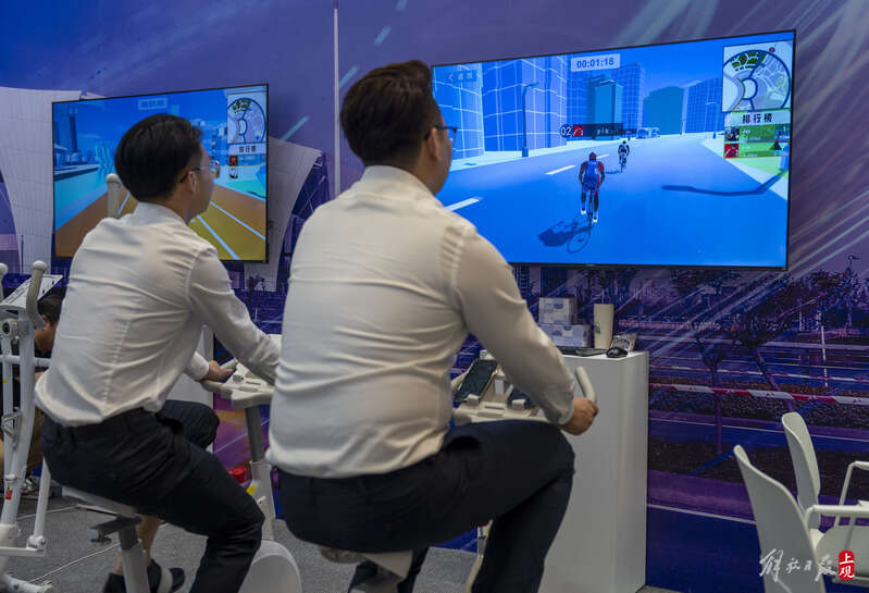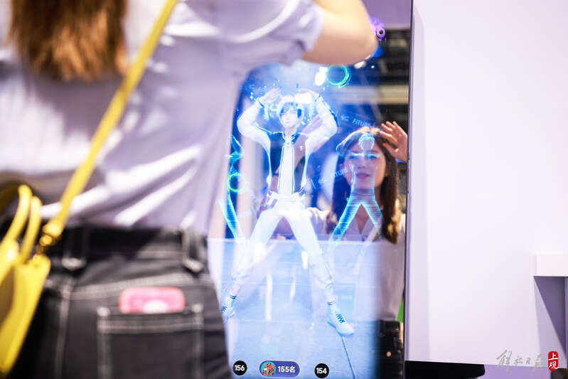 人们在腾讯展台内体验天美健康AI健身魔镜。