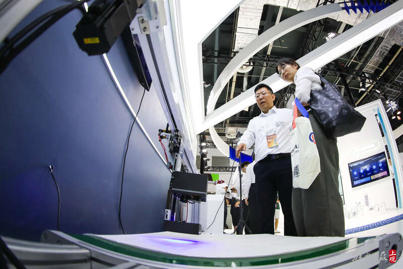 京东展台内展示的微亿智造智能AI外观缺陷检测设备,该系统能够及时检测出缺陷产品,还可以统计分析对比不同批次的产品缺陷图片,输出正确率高达99.9%,相当于给机器装上眼睛和大脑。