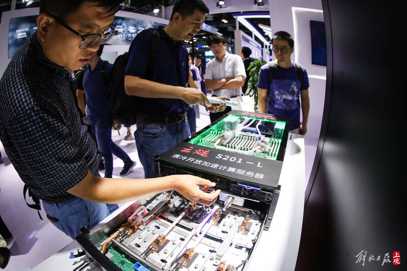 燧原科技展台内展示的液冷开放加速计算服务器。