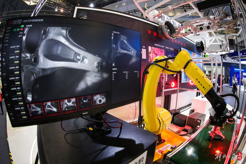 中国电信展出的5G+工业视觉质检,通过智能AI引擎为工业质检、日常巡检、安全生产等各类场景实现数据汇聚和数据治理,有助于提升产品质量,规避人员事故,解决人工质检与巡检难以避免的问题。