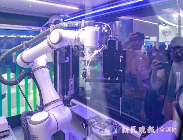 图说:晶泰科技AI药物研发自动化机器人可以在现实中合成AI设计的具有成药潜力的分子,并作测试 新民晚报记者 陈梦泽 摄