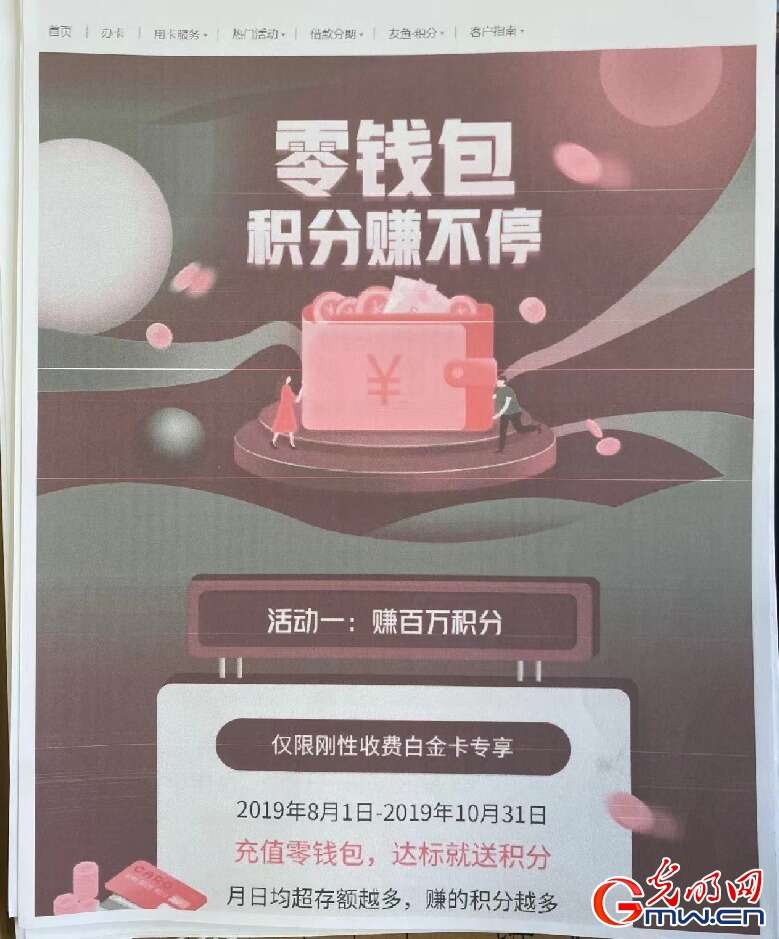 2019年8月,某银行信用卡中心官网发布“零钱包积分赚不停”活动,称刚性收费白金卡充值零钱包达标就送积分,最高可赚180万积分。