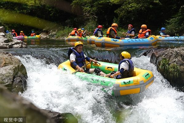 2023年7月9日,湖南怀化,伏天将至,通道侗族自治县万佛山镇龙底河漂流景区吸引众多游客前来漂流、露营,在绿水青山间尽享夏日清凉。据了解,该景区森林覆盖率达87.9%,空气中负氧离子含量高,水流清澈,河水清凉,在山林间漂流、露营等成了人们消除酷暑的好去处。
