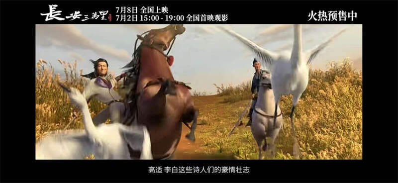 相比于观众所熟悉的用动画表现绚丽奇幻的传说,“新文化”系列意在寻找观众熟悉又陌生的东西。以《长安三万里》为例,熟悉李白、高适诗词的观众比比皆是,但他们的故事对于广大观众而言正是既熟悉又陌生的。因此,“新文化”其实是对于传统文化的一种重新演绎,将很多大众可能不太了解的故事展现出来。“新文化”系列又是指从新的视角解读传统文化,用新的方式去展现传统文化。通过动画电影的形式,观众可以在《长安三万里》中感受壮美的大唐盛景、诗人的豪情壮志以及唐诗流传千年的魅力,品味“独属于中国人的浪漫”。