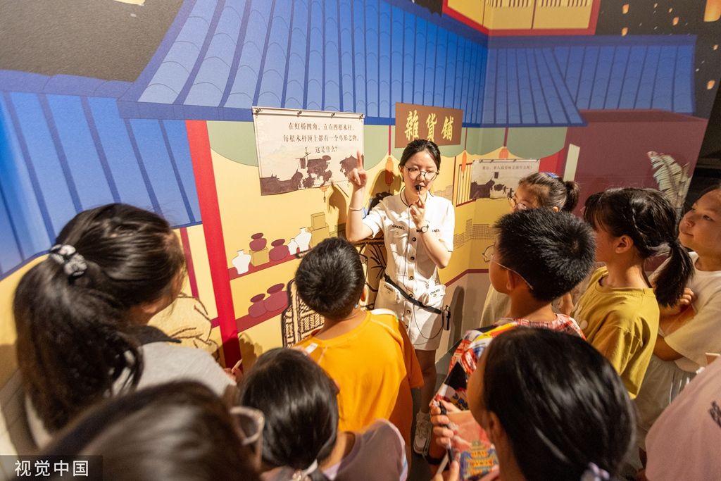 2023年7月11日,浙江台州,温岭市博物馆内,孩子们正认真聆听讲解员讲解。