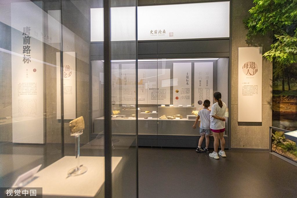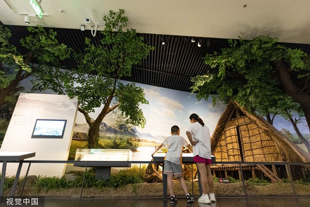 2023年7月11日,浙江台州,温岭市博物馆内,家长带着孩子观看展览。