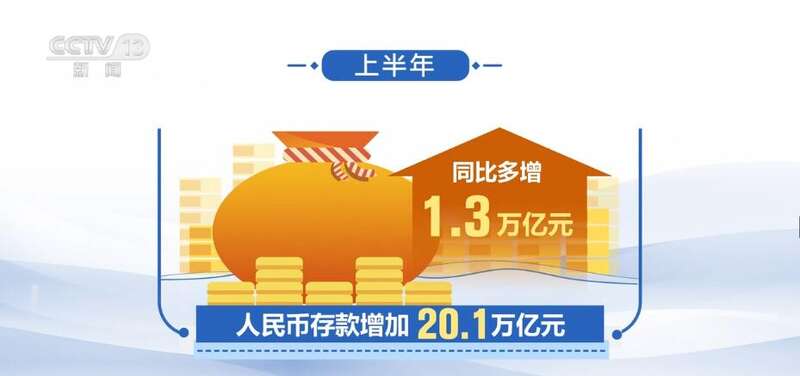 此外,数据显示,上半年人民币存款增加20.1万亿元,同比多增1.3万亿元。