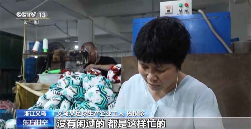 义乌某足球生产企业工人 杨银珍:一天四五百个球要缝,今年好像一来就这个样子的,没有闲过的,都是这样忙的。