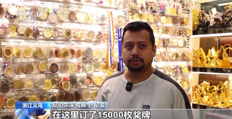 在这家主营各类奖牌奖杯的店铺里,来自尼泊尔的采购商巴尼亚正在挑选各类奖牌,他很快就下了一批订单,这批货品将用于尼泊尔当地日益火热的民间赛事。