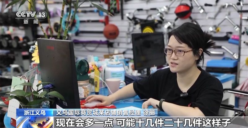 义乌国际商贸城某店铺销售经理 徐丽:最近像足球、排球、乒乓球,以前客户可能带个三件五件,每件五十个,现在会多一点,可能十几件、二十几件。