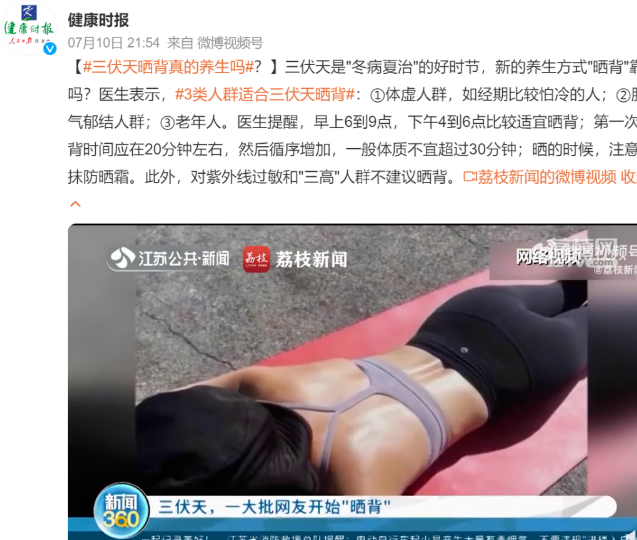 7月10日,南京医科大学二附院主管营养师梁婷婷表示,中医上讲,“三伏天晒背”有祛除体内寒湿气的功效。