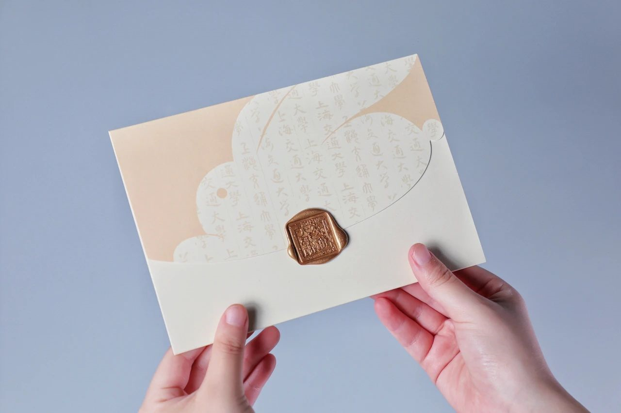 礼盒内包含有丁奎岭校长给2023级本科新生的一封信,方正敦朴的信封拓上“交通大学”古体漆印,兔形图案上是由交大书画篆刻协会的金正浩同学题写的不同古体字形的“上海交通大学”,伴随“大展鸿图(兔)”这一寓意展信过程,寄予新生的美好期盼与祝福呈现在眼前。