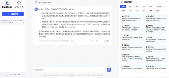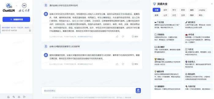 除了聊天问答,AhuGLM还可以在校园生活中提供多种支持,如生成创作灵感、视频脚本、即兴发言稿等,极大提升校园用户的日常学习工作效率。
