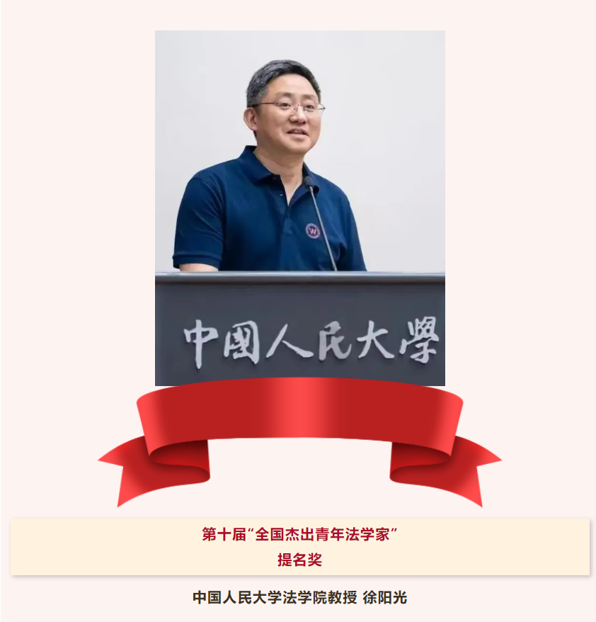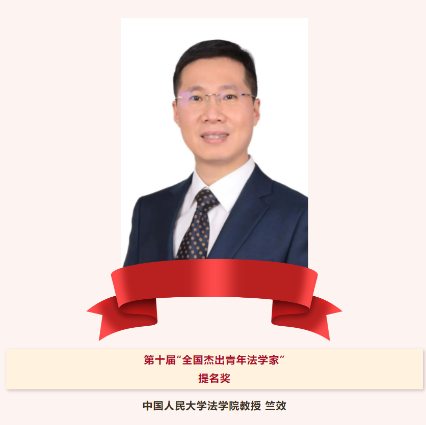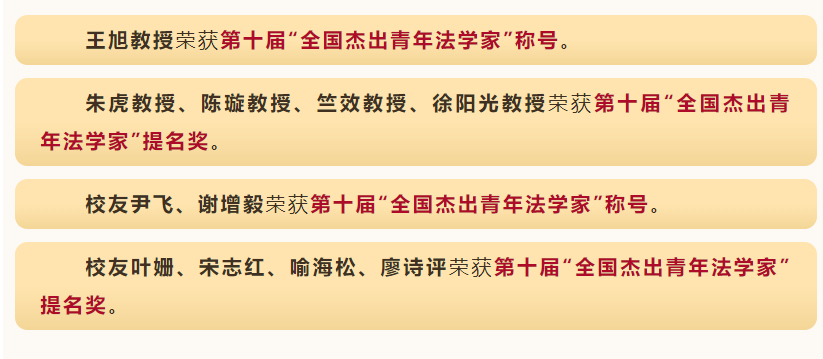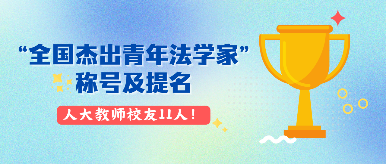 7月12日, 第十届“全 国杰出青年法学家” 评审结果揭晓,经终评委员会评选,产生出第十届“全国杰出青年法学家”10名、提名奖获得者20名。中国人民大学法学院教师及校友共有 11人 获“全国杰出青年法学家”称号及提名奖。