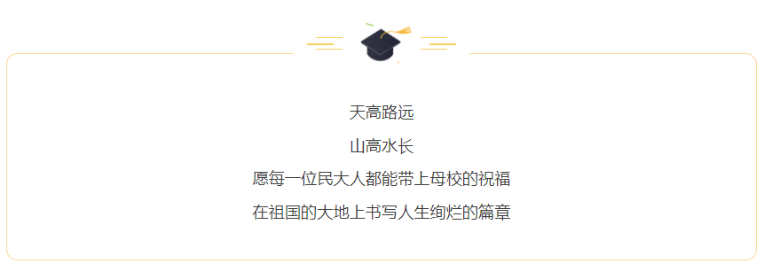 希望大家牢记这个夏天的温暖与感动,带着民大管院给予你的涵养、学识、修为、品德,牢记国家赋予我们青年一代的使命和责任,知重负重、追梦圆梦。最后,衷心祝愿每一位毕业生前程似锦、一生幸福!