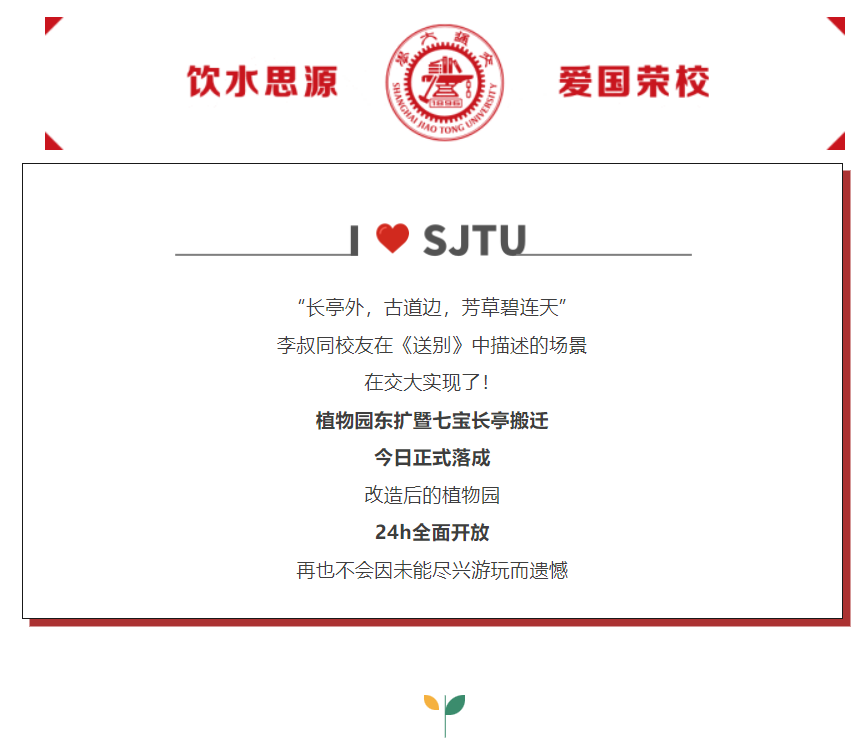 一直以来,闵行校区植物园都是学校生态环境的重要组成部分。为打造环境育人新高地,不断提升校园环境品质,学校后勤保障中心于2023年上半年启动植物园东扩项目,并于2023年7月完工。 如今,东扩改造升级后的植物园向东延展与淡水河交相呼应,水光一色,为美丽的交大校园增添新的风景。历史悠久的七宝长亭搬迁落成,更是增添了校园人文气息,展现校史发展沿革的丰富内涵。