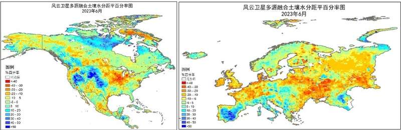 基于融合风云三号D星在内的多源卫星数据制作的土壤湿度距平图显示,北美洲南部和东北部、欧洲西北部和南部部分地区土壤湿度较往年同期明显偏低,北美和欧洲土壤湿度较往年偏低20%的区域面积分别达到187.29万平方公里和186.35万平方公里,这些区域正在遭遇不同程度的干旱。