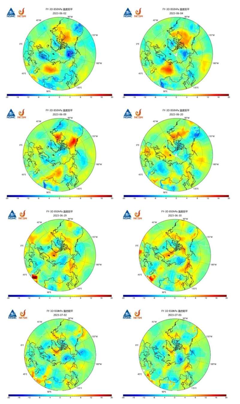 风云气象卫星监测显示,6月2日开始,北美、西亚和欧洲部分地区,出现8℃至12℃偏暖区域。6月底至7月初,北半球多地850百帕温度较去年同期[A2] 平均温度偏高。特别是北美北部和中北亚地区温度持续偏高。