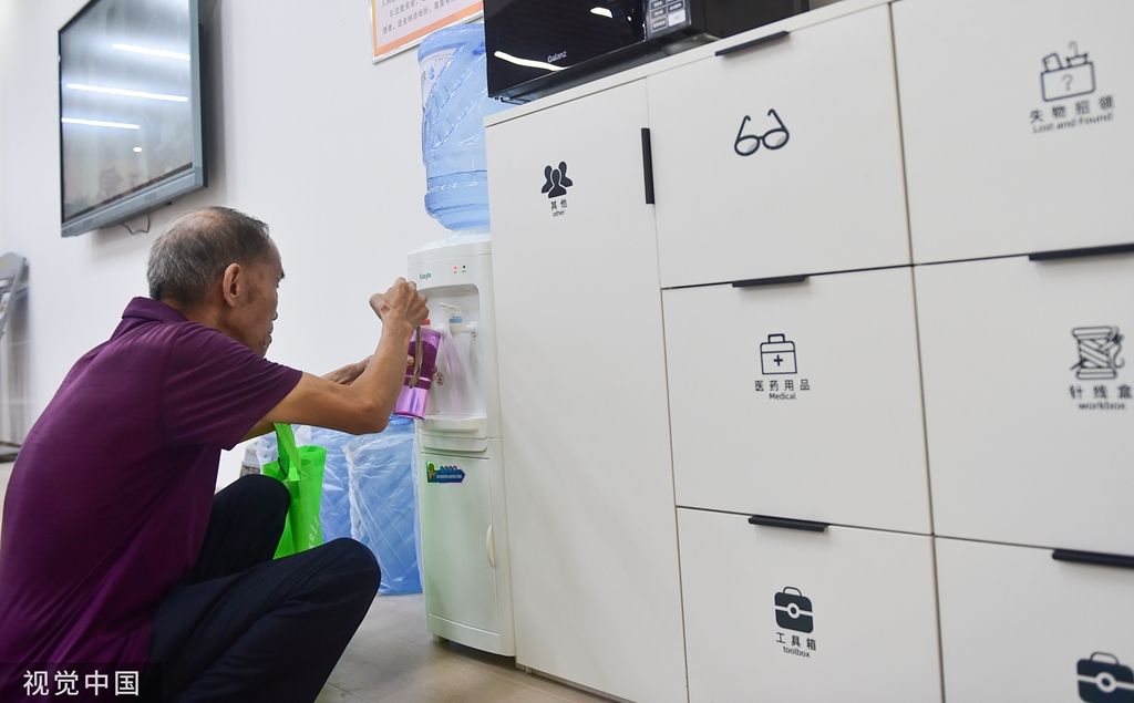 2023年7月14日,市民在河南洛阳市涧西区周山大道地下人防工程避暑纳凉点自助饮用水。
