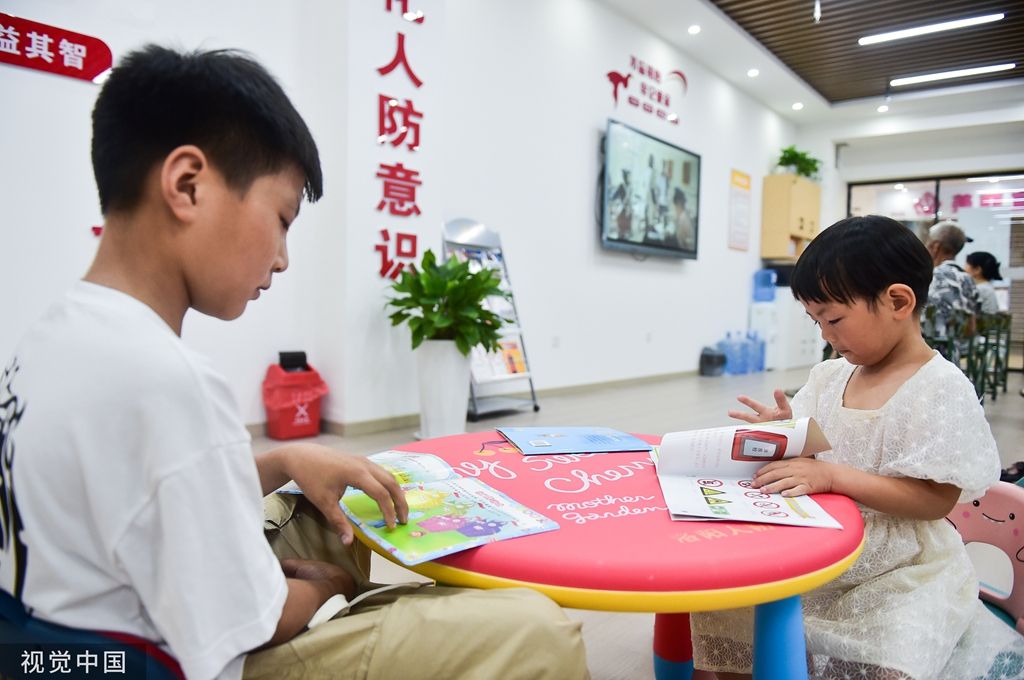 2023年7月14日,河南洛阳,在涧西区周山大道地下人防工程避暑纳凉点,小朋友们阅读休闲。