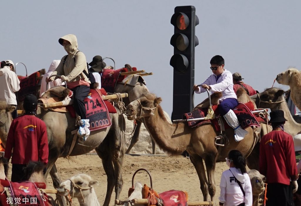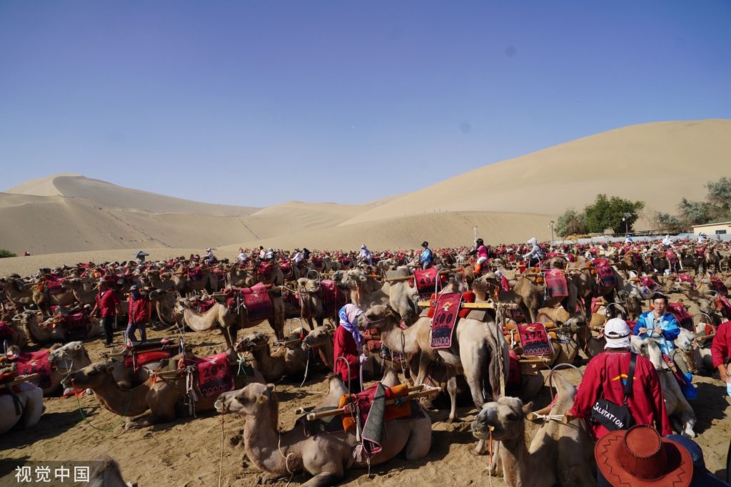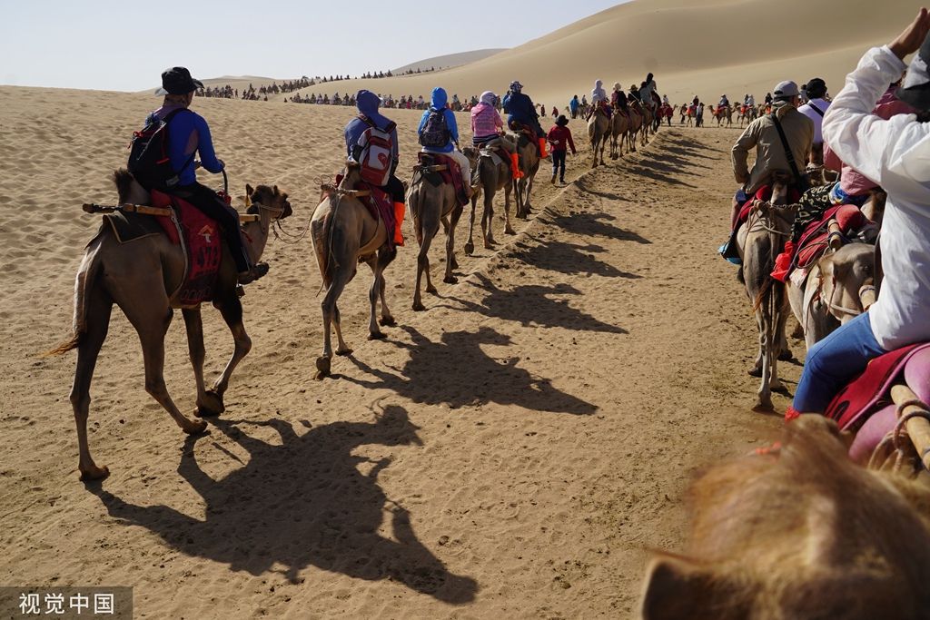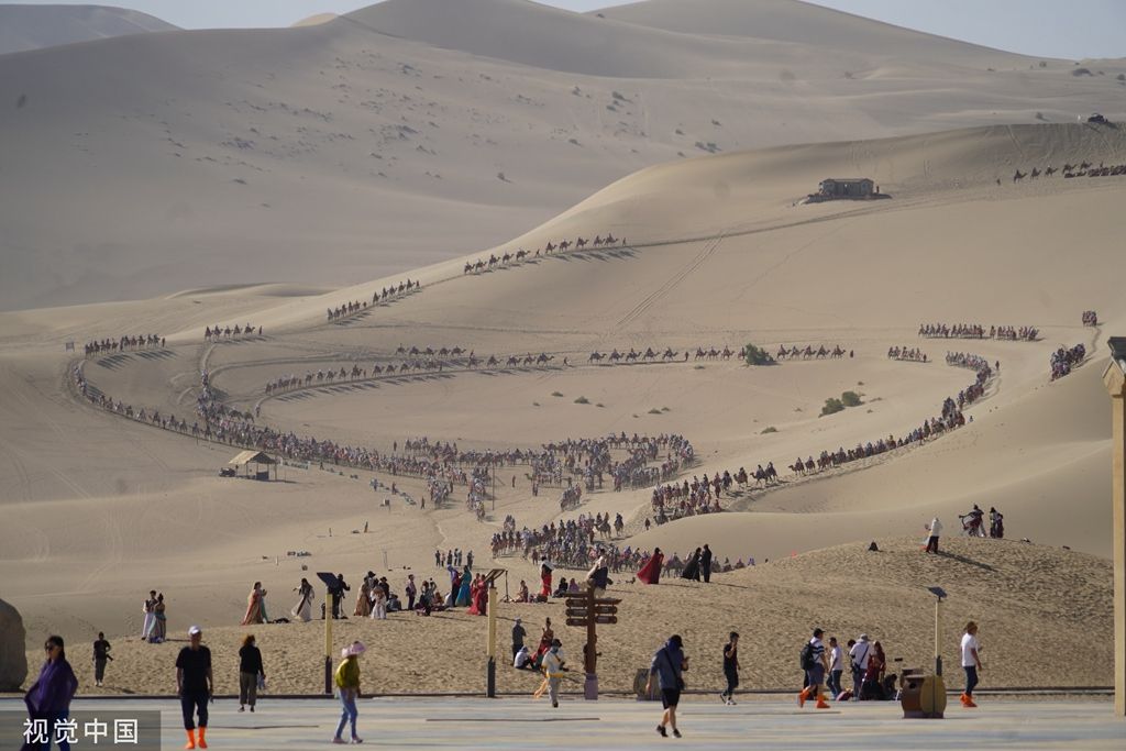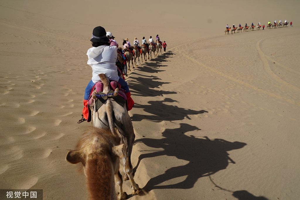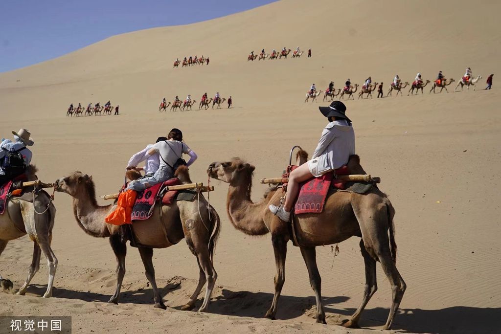2023年7月13日,甘肃酒泉,暑假期间,游客骑骆驼游敦煌鸣沙山景区。
