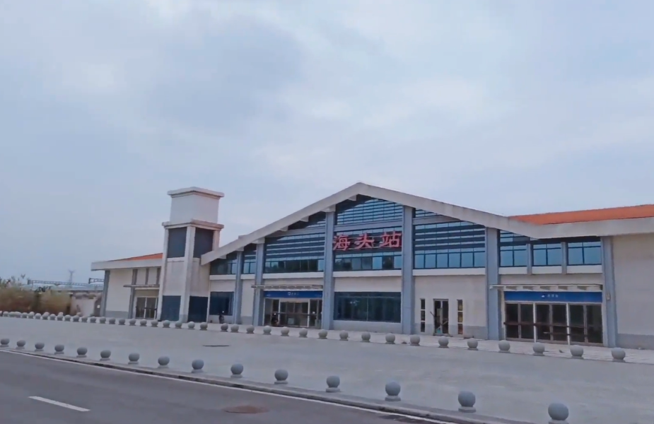海头站房建筑面积1989.35平方米,地下一层,地上一层,结构形式为钢筋混凝土框架结构及钢网架屋面。车站形式为线侧下式,最高聚集人数400人。站台雨棚建筑面积7200平方米,结构形式为钢筋混凝土框架结构。