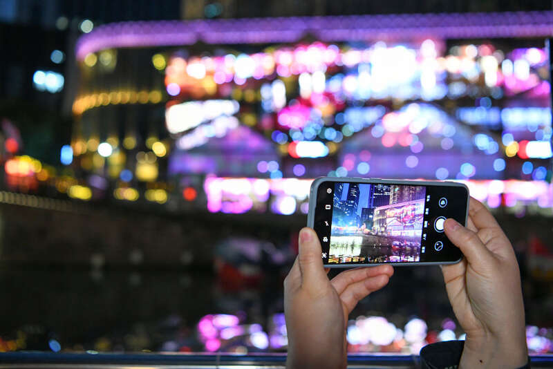 乘客在游船上拍摄岸边灯光秀(2月28日摄)。新华社记者唐文豪摄↑