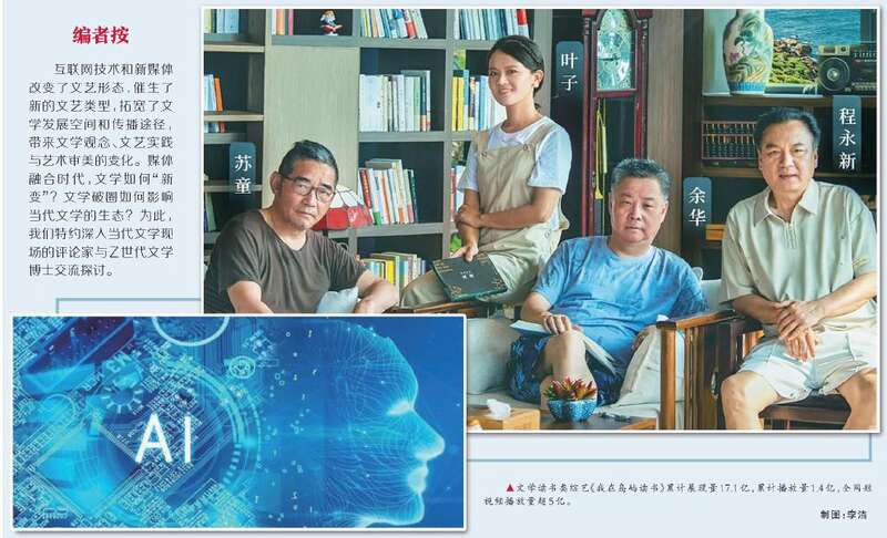 王雪瑛:《文学馆之夜》《文学的日常》《文学的故乡》等有关文学的电视综艺节目让作家的声音抵达观众,文学的氛围从安静的书卷蔓延到日常与现实。以现代传媒的方式打开作家的书房,与观众分享作家们的对谈。余华、苏童、程永新等嘉宾现身《我在岛屿读书》,讨论AI对文学的影响,余华和莫言这对同窗好友更是吸引着受众的围观。看过此类节目吗?有什么内容给你们留下深刻的印象?如何理解这类节目与大众的对话方式?