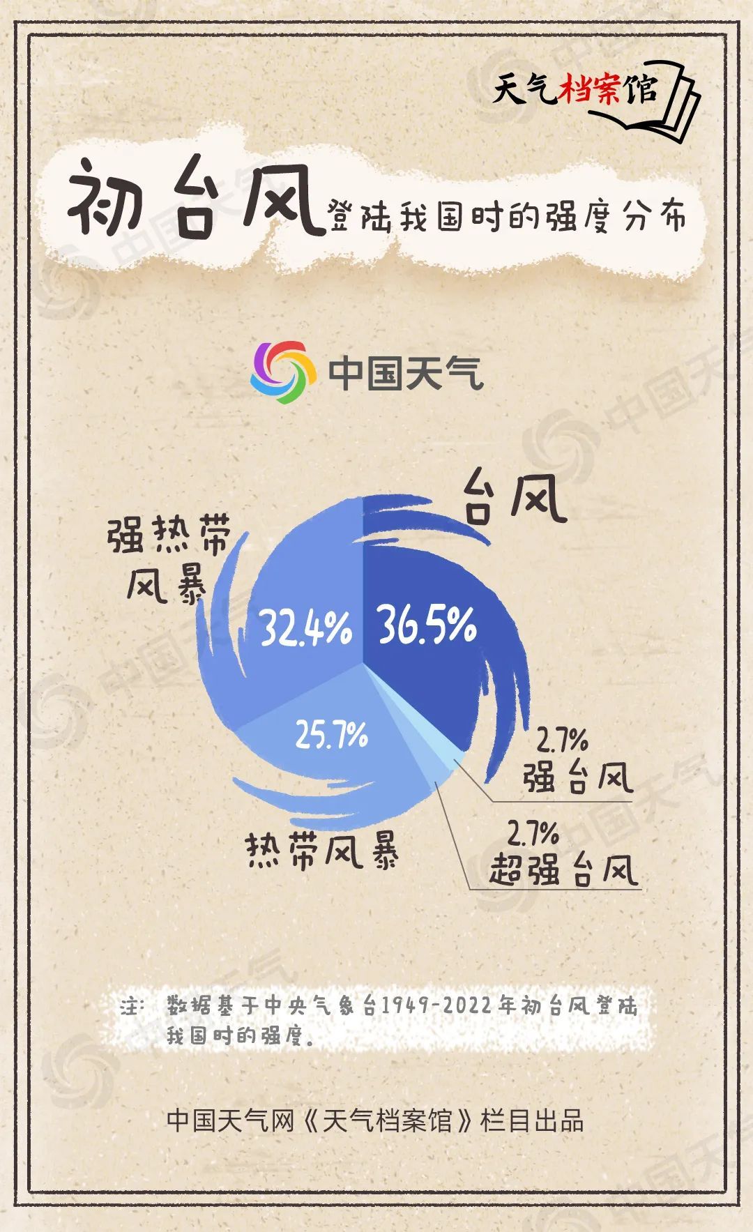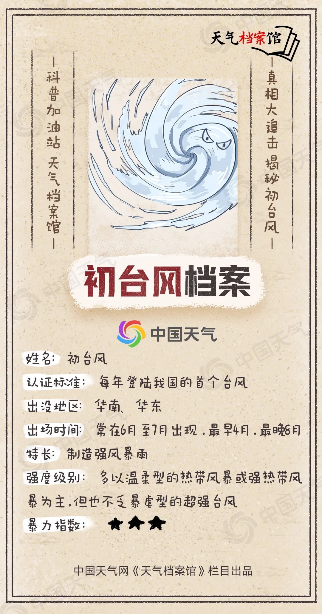 大家好,我叫初台风。也许有人会认为我是每年生成的第一个台风,其实不然,气象部门给我定义的官方认证标准是每年登陆我国的首个台风。划重点,并非生成的首个,而是登陆我国的首个!我擅长制造强风暴雨,不过由于我出现的时候海温常常还不够高,因此我的强度有限,暴力指数三颗星。