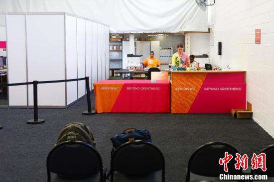 记者在位于新西兰奥克兰市伊甸公园球场的注册中心办理证件。