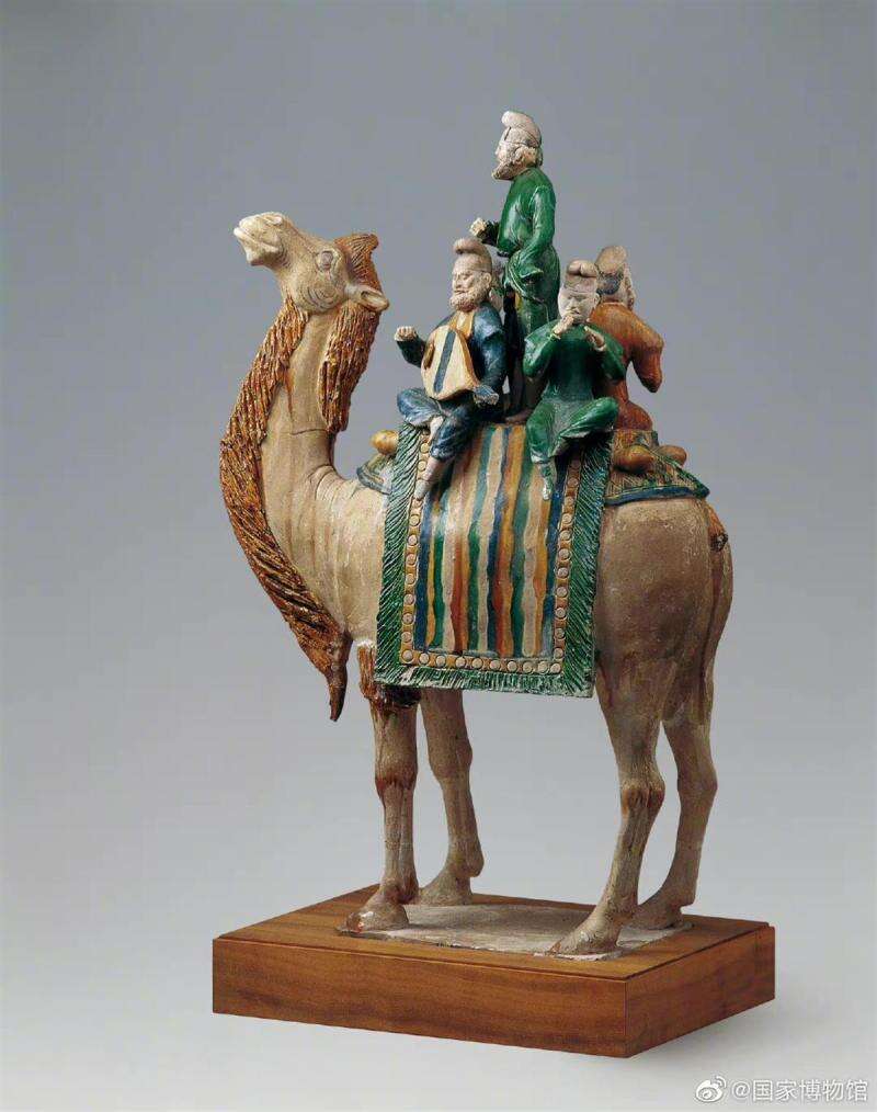 而中国国家博物馆藏三彩釉陶骆驼载乐俑,则更能体现唐朝时音乐舞蹈的多元发展。该器物出土于陕西西安鲜于廉墓,色彩艳丽,闻名海内外,它展示了一支由3位胡人和2位汉人组成的乐队,骑在骆驼上进行着表演。