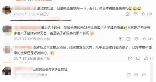 还有网友想起了“遇火不坏”的北京奥运会奖牌:“俄罗斯艺术体操运动员,她家里发生火灾,几乎全部物品都烧毁了,但2008年在中国拿的金牌还是好端端的。”