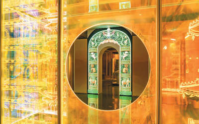此次展览展出了大报恩寺塔的铜版画与构件,并用新媒体手段打造沉浸式展区,重现琉璃塔的绚丽辉煌。光影投射出的琉璃拱门上,飞羊、狮子、白象等六拏具动了起来,活灵活现。