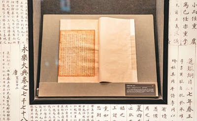 永乐元年(1403年),朱棣决定修一部巨著彰显国威,这便是中国古代规模最大的类书《永乐大典》。全书辑录各类图书8000余种,总计11095册、22877卷,约3.7亿字,在南京修纂而成,朱棣亲自作序并以年号赐名。这一皇皇巨著如今仅存明嘉靖年间抄本400余册,整个南京仅有一残页藏于南京图书馆。此次展览中展出了南京图书馆收藏的《永乐大典》残页,泛黄的纸页上字迹依然清晰。残页无法辨识卷目及书名,内容共计440字,引录6种古籍条文。经专家推断,此页应为《永乐大典》中《周易·系辞》篇的一部分。真品旁还放置了《永乐大典》复刻书,供观众翻阅感受。