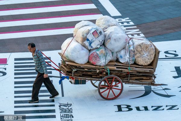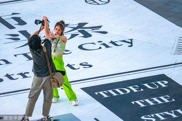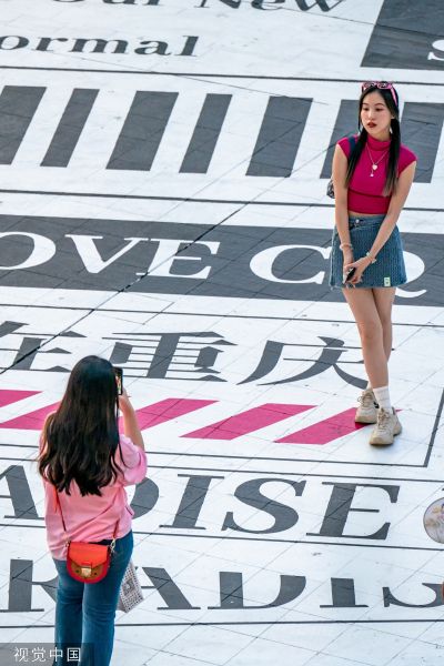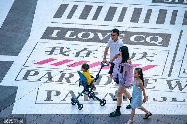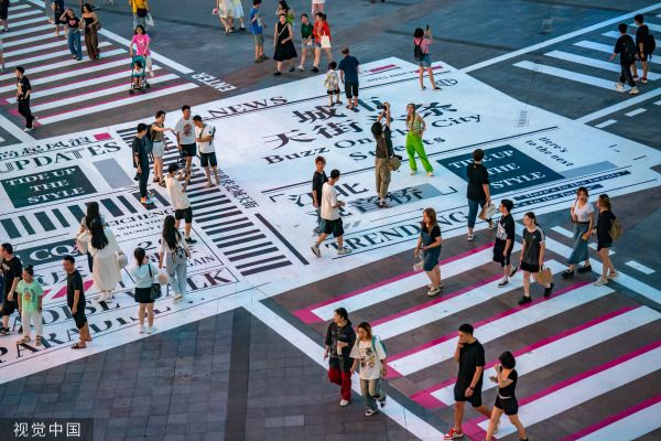 2023年7月17日,重庆,观音桥北城天街门口的网红斑马线3.0版正式亮相,吸引众多市民和游客打卡拍照。