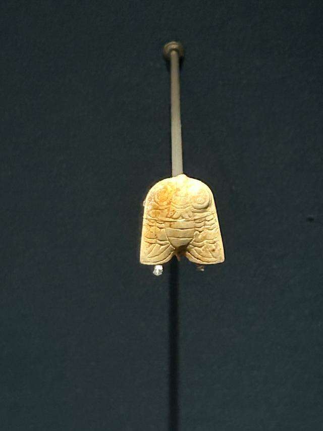 其中M106出土了龙首镯、镂孔兽面纹冠状器、璜串、玉蝉等重要玉器,此次展厅内就陈列展出了北村遗址M106出土的龙首玉镯、玉蝉等。玉蝉在中国的文化中有着非常特殊的意义。自汉代以来,皆以蝉的羽化比喻人能重生。将玉蝉放于死者口中称作含蝉,寓指精神不死,再生复活。