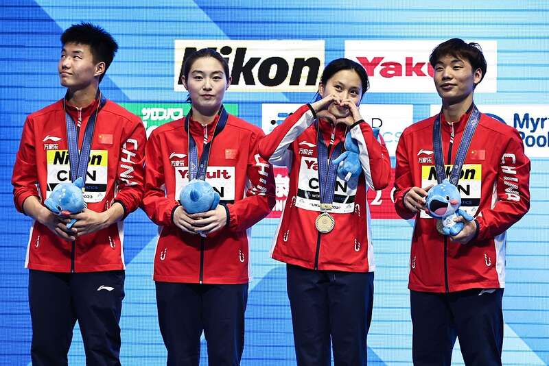 中国队获得2023年福冈游泳世锦赛跳水混合团体金牌。视觉中国供图