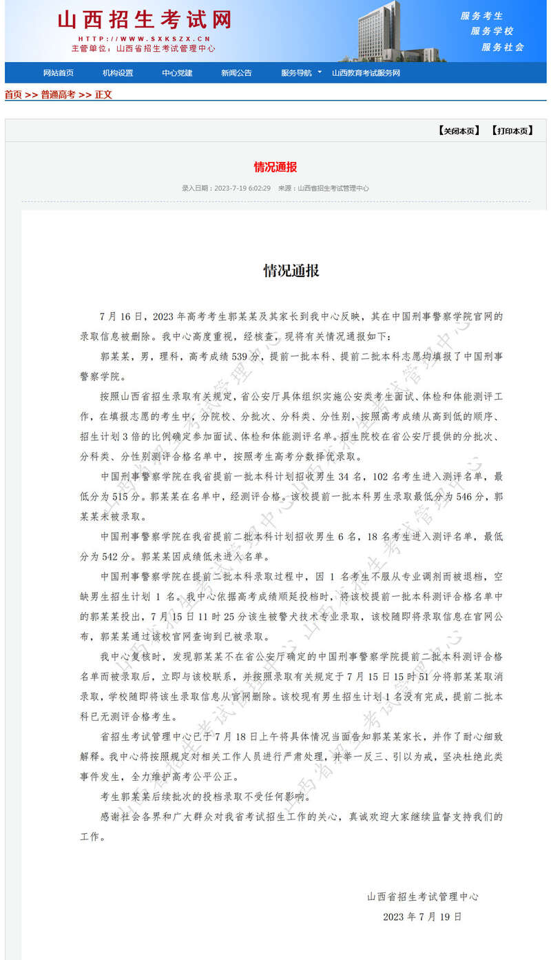 中新网7月19日电 据山西招生考试网消息,山西省招生考试管理中心19日发布情况通报称,7月16日,2023年高考考生郭某某及其家长到该中心反映,其在中国刑事警察学院官网的录取信息被删除。该中心高度重视,经核查,有关情况如下: