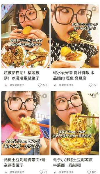悦悦子(化名)最早是从粉丝口中听说“电子小猪”这个词的,“有一天,粉丝突然这样喊我,说我是他们的‘电子小猪’。”悦悦子当时并未感受到侮辱或嘲讽的意味,她只觉得这个昵称十分可爱,也恰好能够定义她做吃播视频号的创作方向。