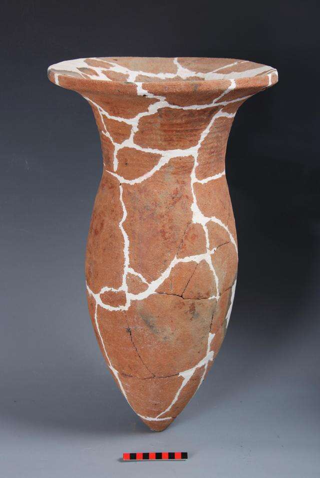 最让人意外的是一件红陶尖底瓶,那是典型的中原仰韶文化器物。这件尖底瓶像一枚炮弹,尖底空腹,周边还有一圈系绳的耳,从器型上判断,这是仰韶文化中期的作品,不知通过什么样传奇的经历,千里迢迢从黄河中游来到了长江下游。