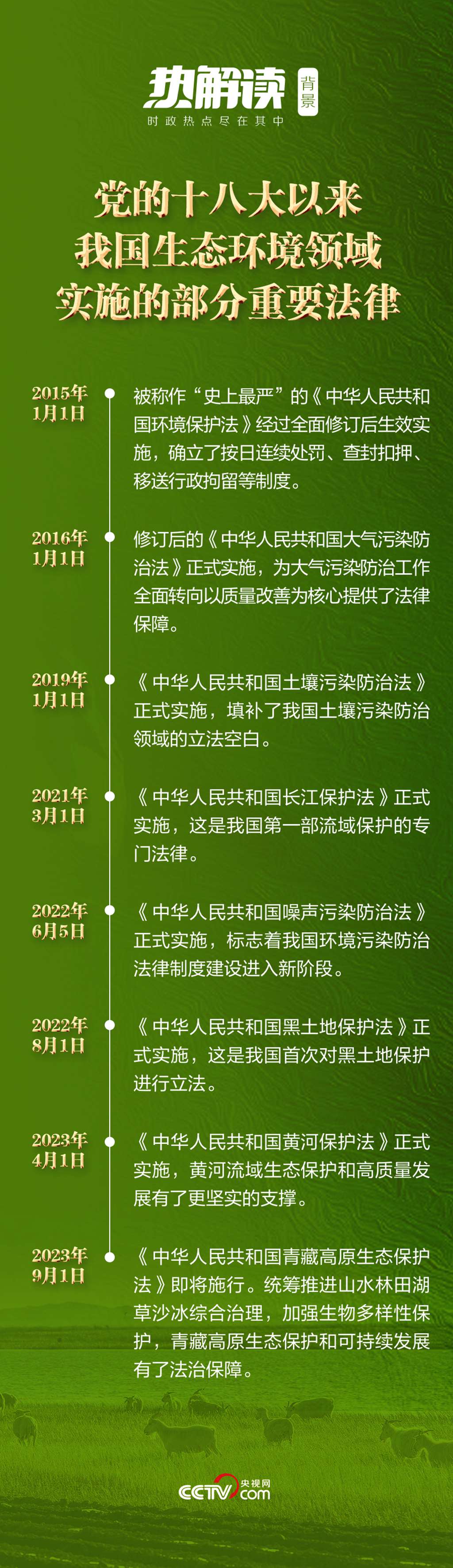 党的十八大以来,越织越密的生态文明制度体系成为生态文明建设的有力保障。将“生态文明建设”写入宪法,制定和修改长江保护法、土地管理法、森林法等,我国生态环境立法实现了从量到质的全面提升。