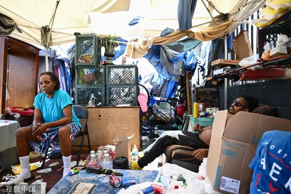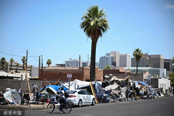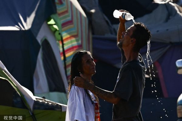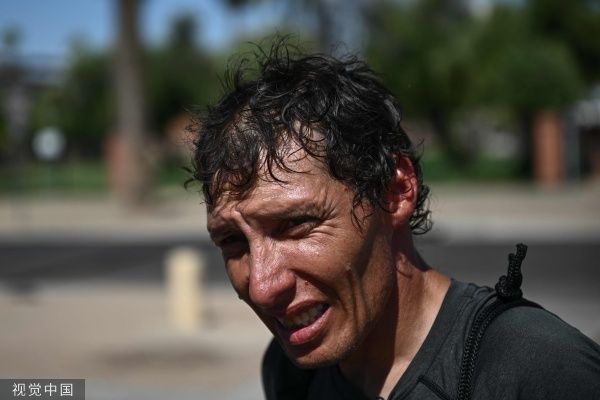 当地时间2023年7月18日,美国凤凰城,创纪录的热浪中,达纳·佩奇(左)在“the Zone”营地讲述了他们在街头的生活,“the Zone”是巨大的无家可归者营地,数百人居住在那里。和美国西南部的大部分地区一样,凤凰城被沙漠包围,160万居民已经习惯了炎热的夏季。但今年的热浪在时间上是前所未有的:它已经超过了之前连续18天在华氏110度(43摄氏度)以上的记录,预计下周也会出现类似的高温。在亚利桑那州首都凤凰城的人行道上,创纪录的热浪促使人们限制外出时间。