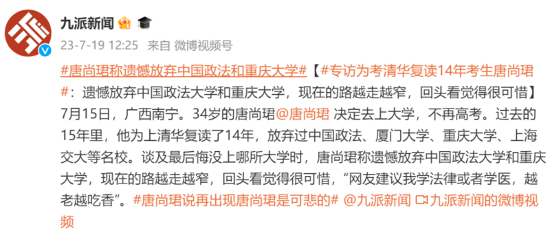 这些年,唐尚珺曾相继被中国政法大学、厦门大学、广西大学、重庆大学等知名高校录取,他都没有去读。2022年,唐尚珺考了597分,被上海交大护理专业录取,身边的家人、朋友都劝他去读。最终,他还是犹豫了,没有去报到。他觉得专业不合适,且这次高考发挥失常,“虽然(明年)清北不一定考得上,但有信心考得比今年好”。