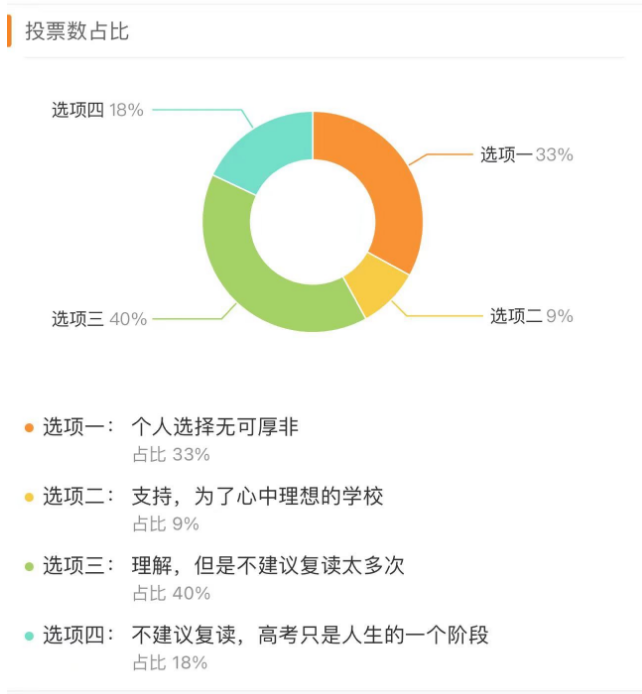 在媒体发布的投票中,多数网友理解唐尚珺的遭遇,认为复不复读都是个人选择无可厚非,也有网友表示,高考只是人生的一个阶段,不建议复读。