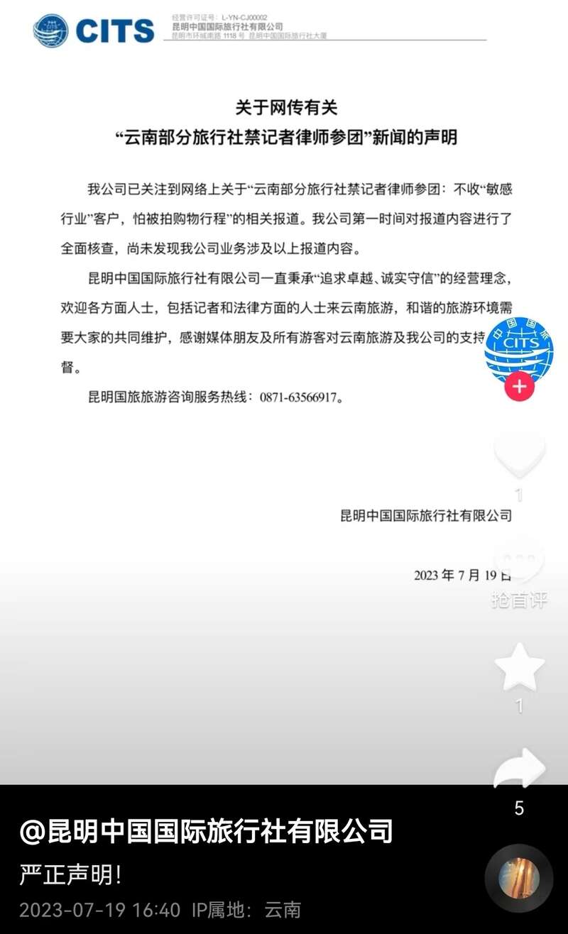 19日,昆明中国国际旅行社有限公司发布相关声明,称公司已关注到网络上关于“云南部分旅行社禁记者律师参团:不收‘敏感行业’客户,怕被拍购物行程”的相关报道,第一时间对报道内容进行了全面核查,尚未发现公司业务涉及以上报道内容。