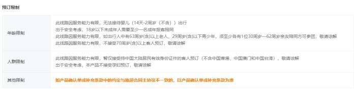 19日,记者浏览某在线旅游平台的多个跟团游页面,发现在预订限制一栏中,会有年龄限制、人群限制和其他限制。但多是不接受孕妇预订,并未有记者等职业限制。